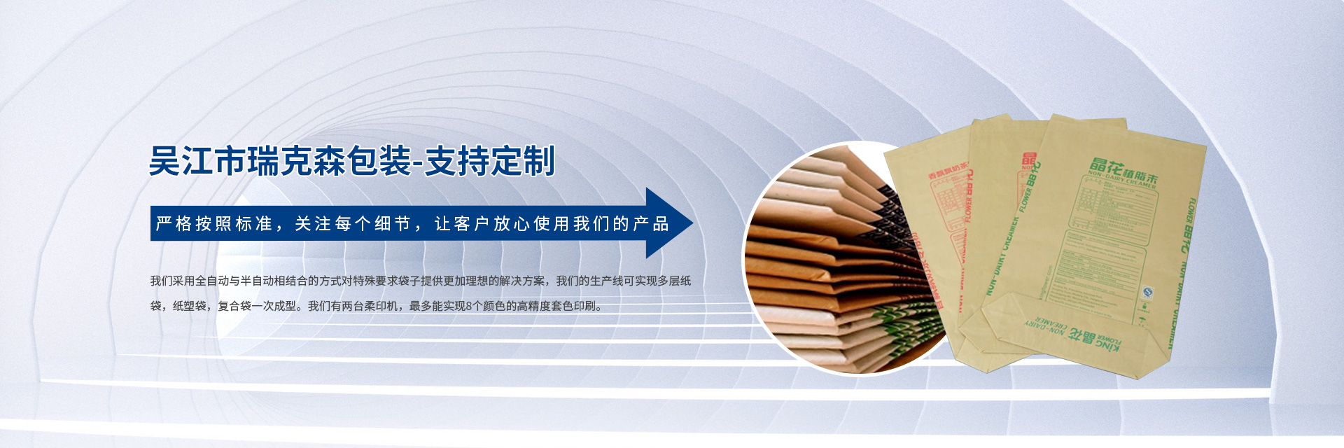 吳江市瑞克森包裝有限公司成立于2012年,坐落于蘇州太湖新城.我們主要為植脂末,奶粉,維生素等食品藥品企業(yè)提供包裝配套服務(wù)。瑞克森以安全,品質(zhì),環(huán)保,服務(wù)為經(jīng)營理念,建立符合食品衛(wèi)生要求的制造環(huán)境,并通過QS食品包裝安全許可證,IOS9001質(zhì)量體系認(rèn)證。公司始終堅持采用優(yōu)質(zhì)的原料跟生產(chǎn)工藝,生產(chǎn)的閥口袋,方底袋,熱封口袋,紙塑復(fù)合袋等完全能滿足全自動灌裝的要求。